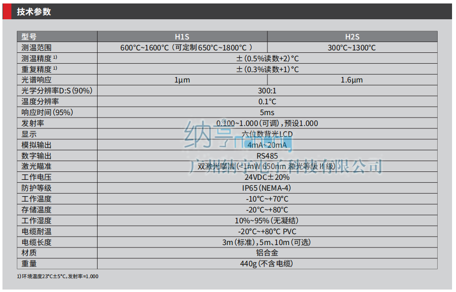 - Product description: 短波紅外測溫儀IS50P H1/H2 高性能短波紅外測溫儀: 寬測溫范圍,300℃~1600℃(分段),適合廣泛高溫測溫應用 鋁合金外殼,IP65防護等級,適合工業現場應用 高品質光學透鏡,距離系數300:1,適合遠距離測溫 4mA~20mA電流模擬輸出,適合接入工業現場PLC RS485數字通訊,可現場組網 自帶雙激光瞄準,準確指示測量目標 自帶LCD顯示和操控面板,可方便設置參